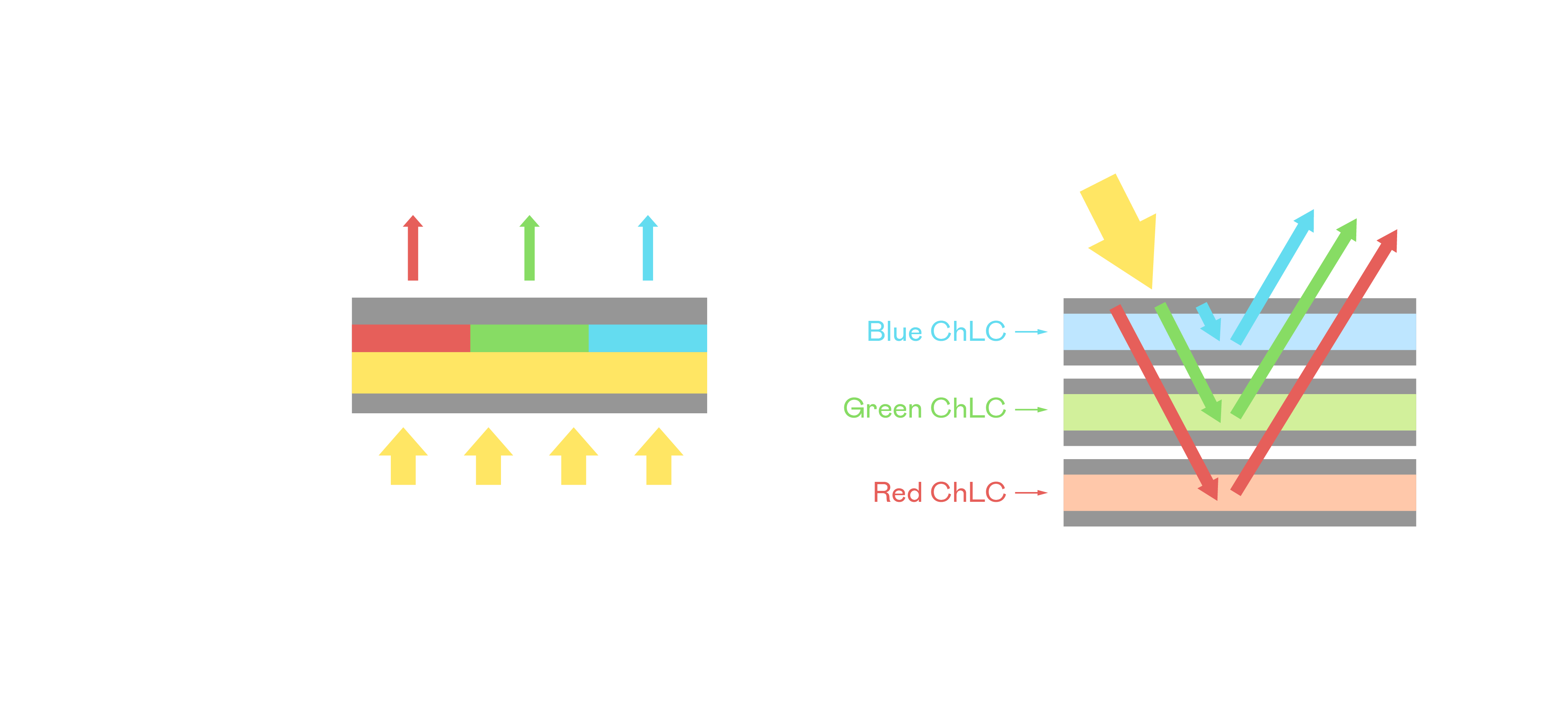 尊龙时凯胆固醇液晶显示器是由红、绿、蓝三层胆固醇液晶面板堆叠而成,并采用无彩色滤光片设计,减少环境光在反射过程中的损耗。